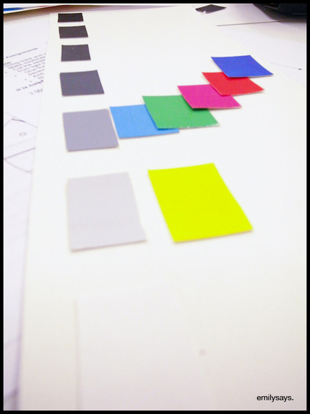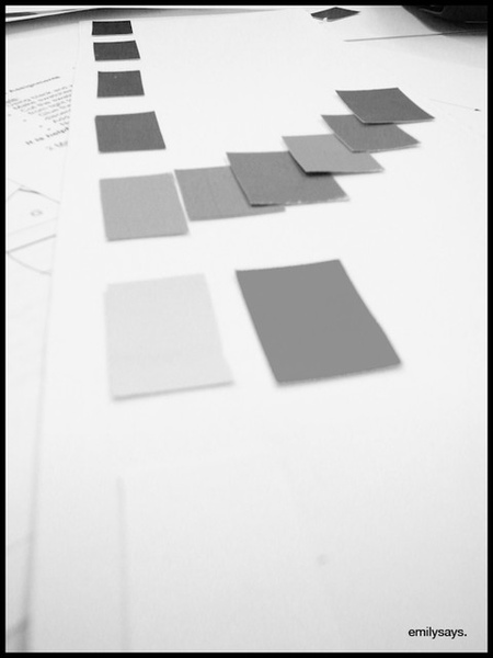 然後訓練我們的眼睛如何[不要看到色彩],只看到黑白和光影,把這些色卡擺在差不多深度的灰旁邊。攝影課老師也要我們不斷去嘗試看光和影,可是世界上這麼多五顏六色的東西,都已經看見了,要[假裝看不見]很難啊。這是轉成黑白的樣子。很明顯的,最下面那張比起左邊的白色,太深了。