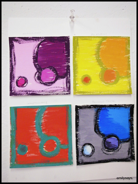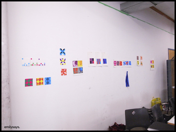 Assignment: 同樣 pattern 然後分別用不同的顏色搭配:對比色,相近色,同一色但不同深淺。每次大家的作品都會釘在牆上讓大家欣賞,儼然是個小畫展。