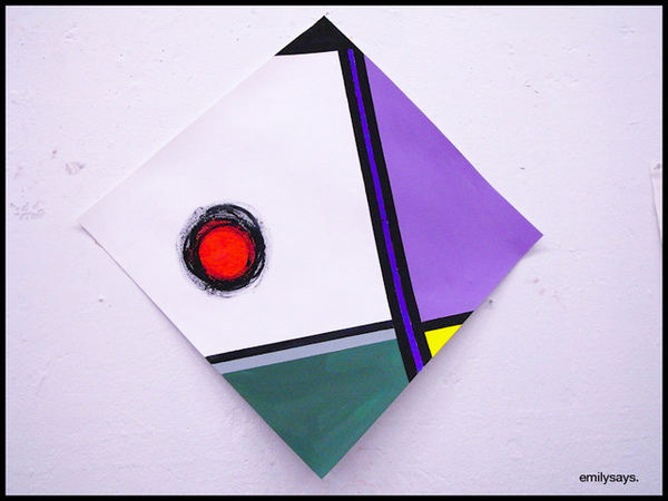 最後一堂課要用上課時間畫出一幅[自畫像],只能用顏色,線條,還有簡單的幾何圖形(方形,圓形,和三角形)代表自己的特質。老師先和大家討論幾何圖形通常給人的印象,方形通常代表:男性,固執,公正,剛強,有條理...等等,圓形代表:永恆,女性,溫柔,圓滑,完整...等等,顏色方面呢,紅色代表熱情,勇敢,奔放,暴力,殘忍...等等,藍色通常比較憂鬱,沈穩,內斂,冷酷,平靜...然後每個人各自列出自己的人格特質,試著把這些特質畫出來。